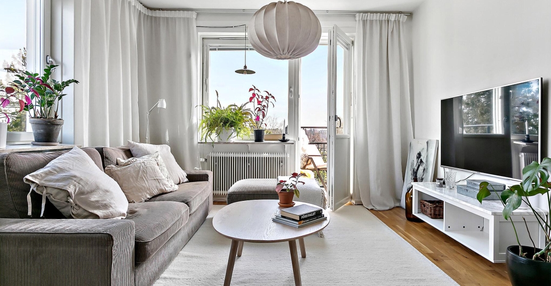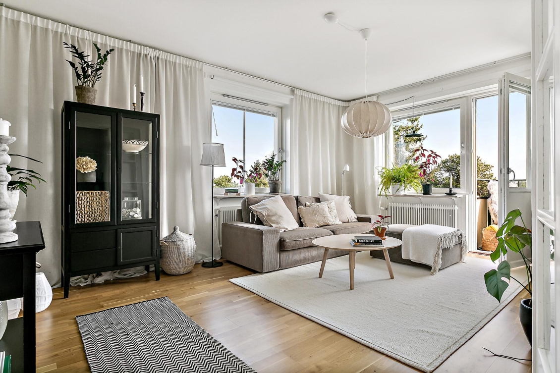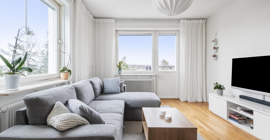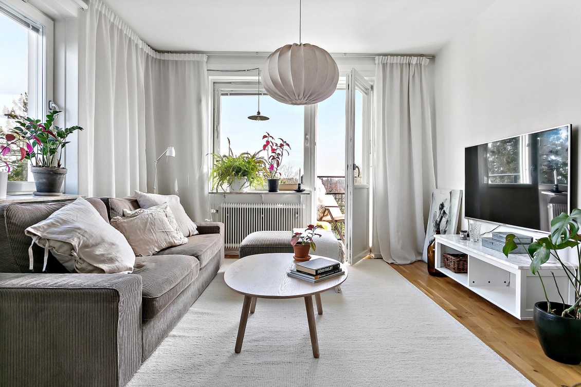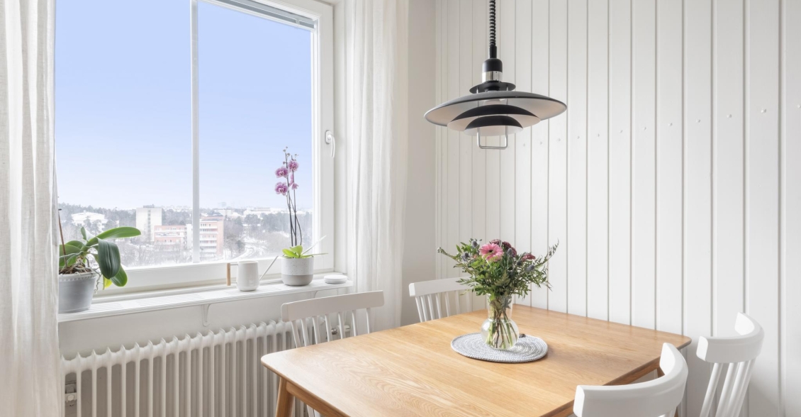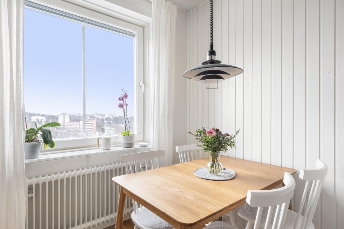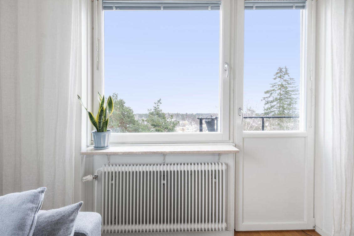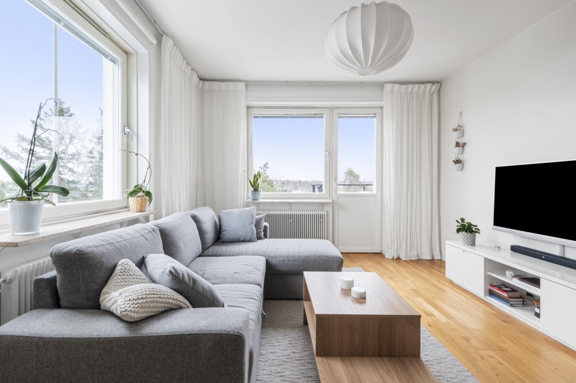 Ett ljust och inbjudande rum i förmånligt gavelläge med generöst ljusinsläpp från två väderstreck. Härifrån har du en vacker utsikt över naturmarken och Globen i fjärran. Rummet erbjuder gott om plats för både soffgrupp, mediemöbel och matplats för större sällskap. Från vardagsrummet nås den soliga balkongen – en rofylld plats att njuta av utsikten över trädtopparna och villaområdet nedanför.