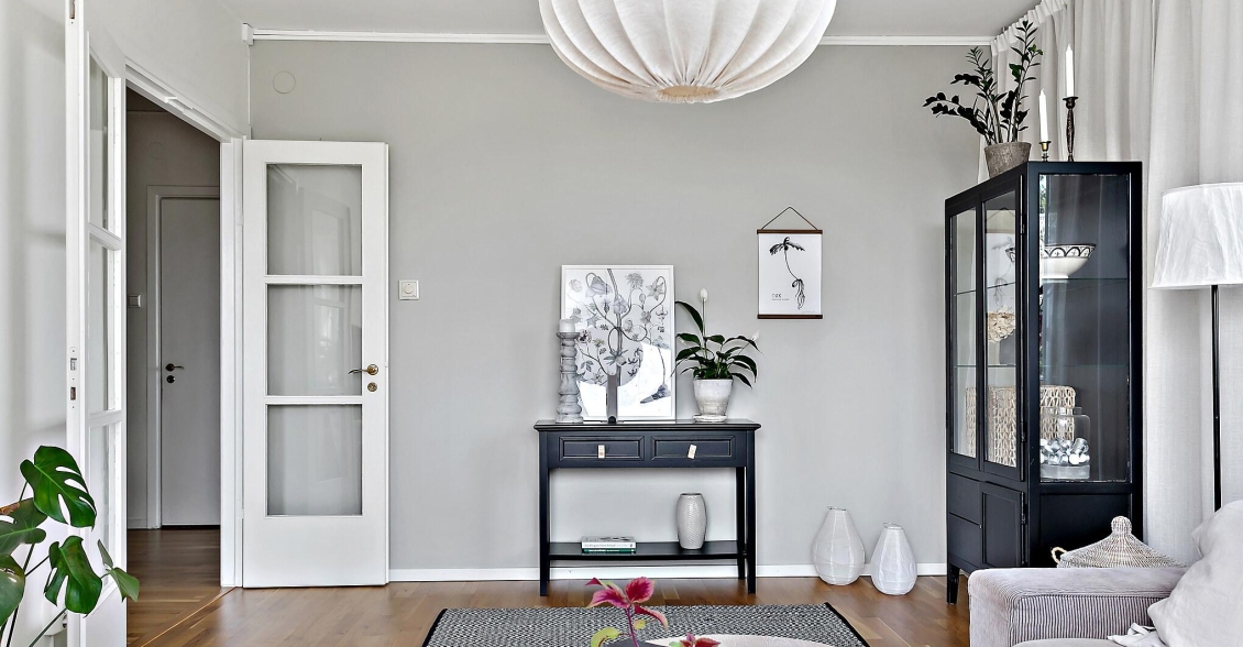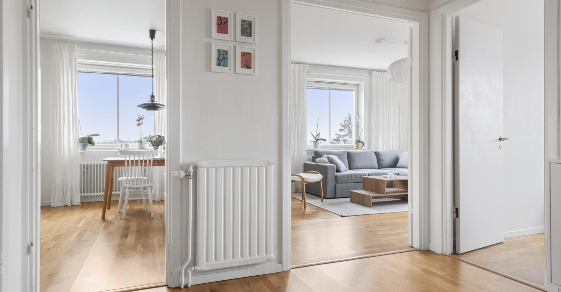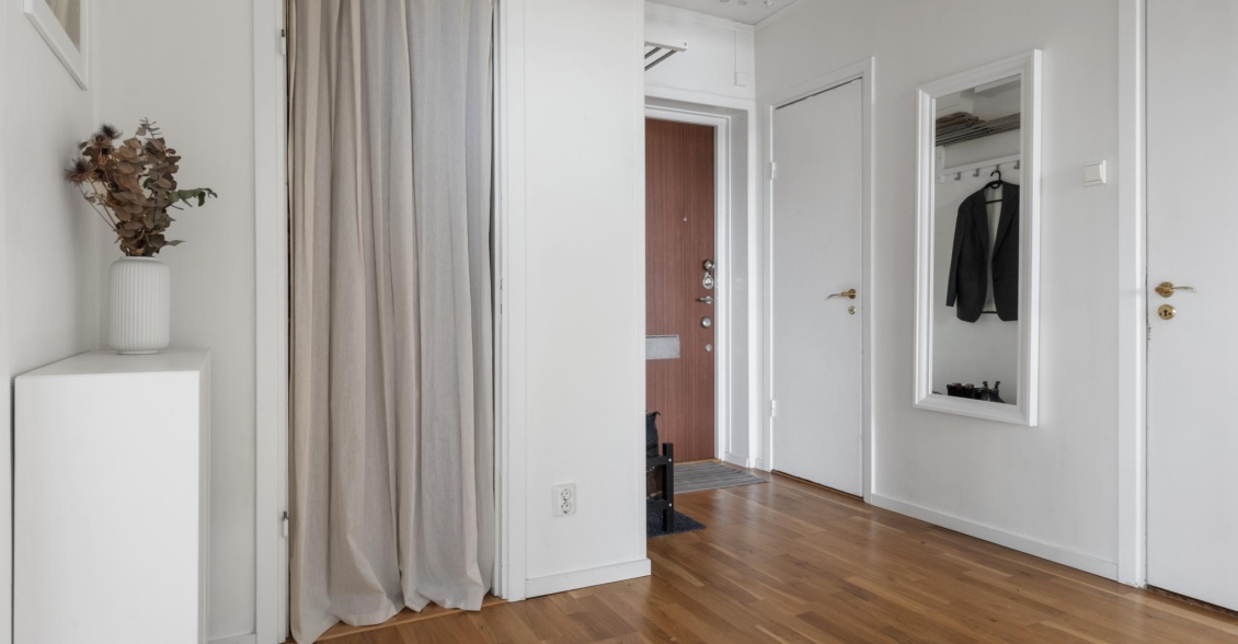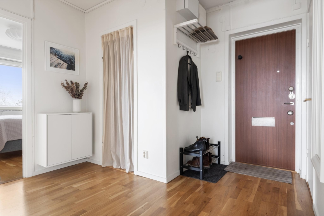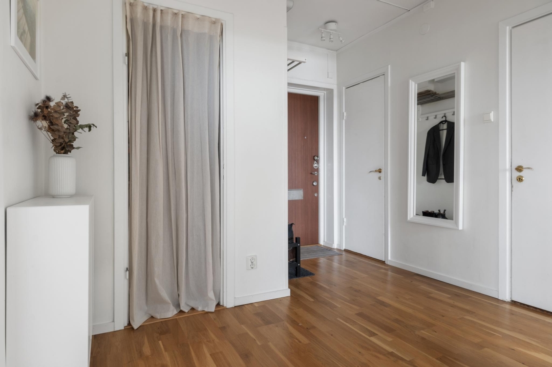 Genom säkerhetsdörren välkomnas du av en rymlig hall med gott om förvaring. Här finns hatthylla och två klädkammare – den ena smidigt placerad direkt innanför dörren för avhängning av ytterkläder och skor, den andra i anslutning till sovrummet med generöst utrymme för kläder och säsongsförvaring. Vackra ekparkettgolv löper vidare in i bostadens övriga rum och skapar en enhetlig och välkomnande känsla.