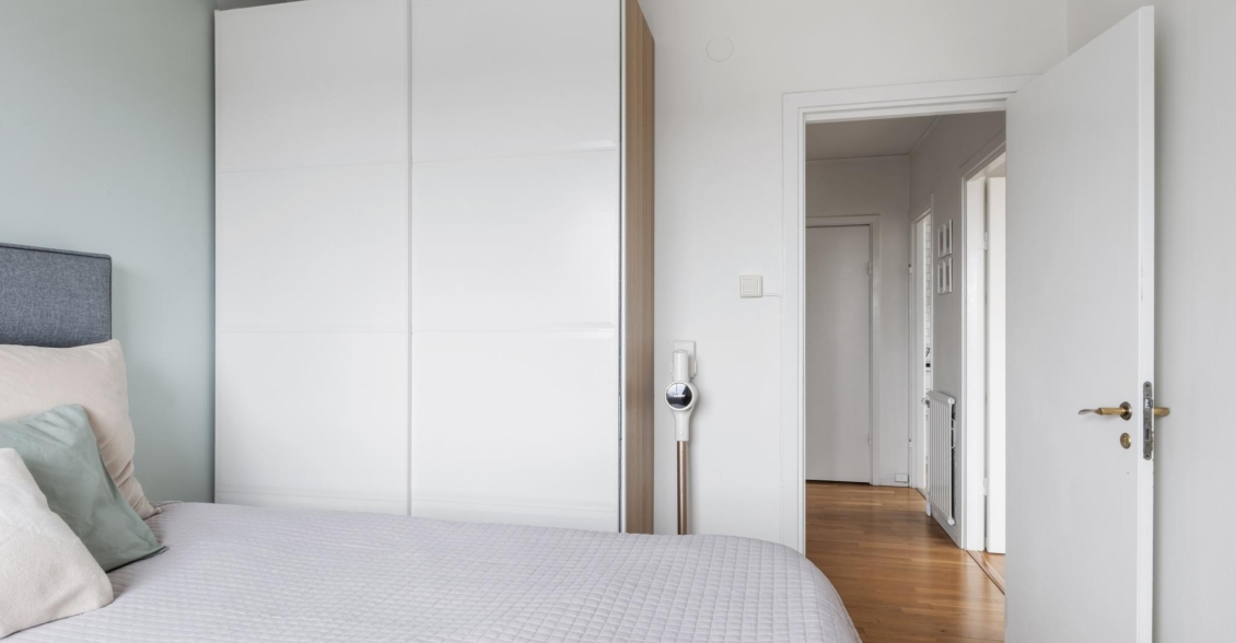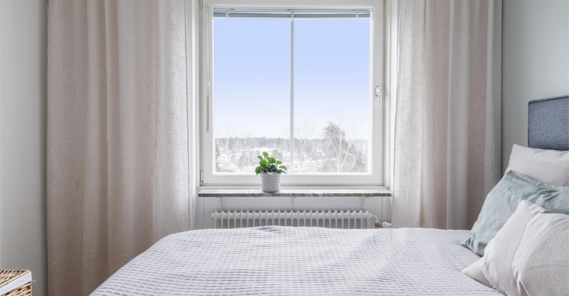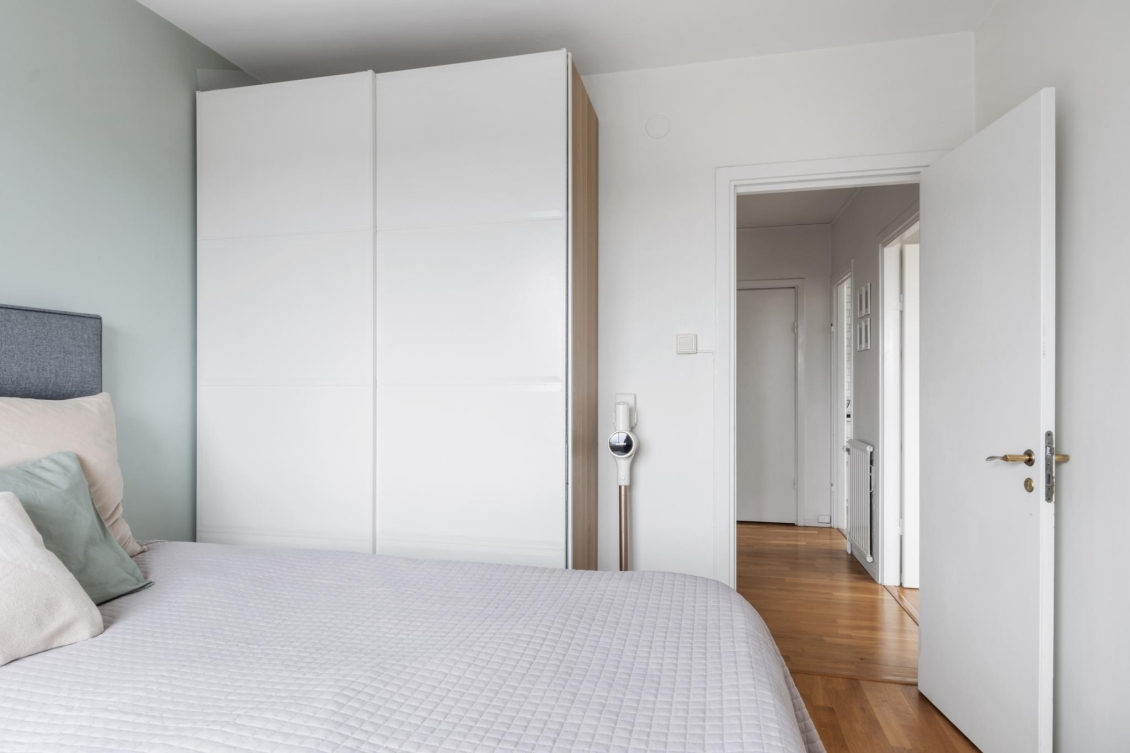 Ett lugnt och avskilt sovrum med plats för dubbelsäng, sängbord och förvaringslösningar. Fönstret i västerläge ger ett mjukt eftermiddagsljus och fin utsikt. I anslutning till sovrummet finns en rymlig klädkammare med gott om plats för kläder och tillbehör.