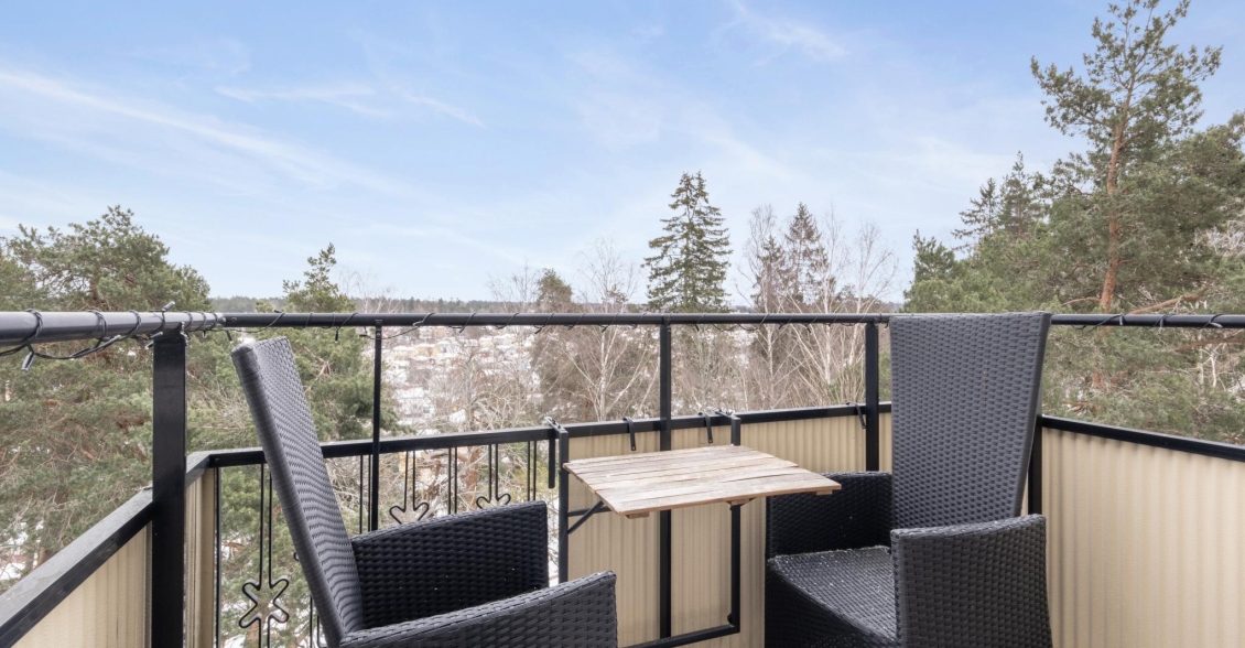Solig balkong i sydostläge med fri utsikt över trädtopparna, naturmarken och det charmiga villaområdet nedanför. Här finns gott om plats för möbler, växter och avkoppling – en perfekt plats för morgonkaffet eller en lugn stund i solen.