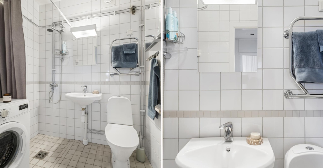 Helkaklat badrum i vitt och ljusgrått från föreningens stambyte 2007. Utrustat med dusch, wc, handfat, spegelskåp, handdukstork och tvättmaskin. För den som önskar extra klädvård finns även föreningens moderna och välskötta tvättstuga bekvämt belägen i samma trapphus.