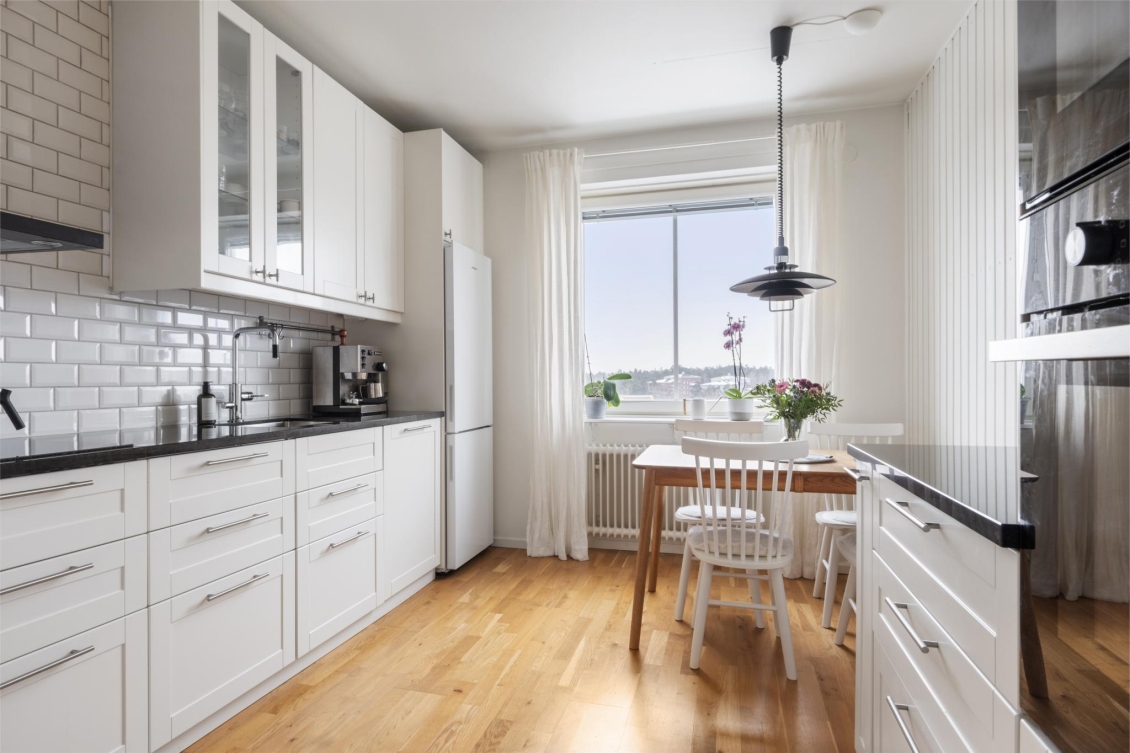 Modernt och stilrent kök med gott om förvaringsutrymme i både skåp och lådor i vitt utförande. Överskåp med glasdörrar ramar in platsen för finporslinet och ger ett luftigt intryck. Väggarna pryds av fasade vita kakelplattor ovan en mörk bänkskiva i sten med nedsänkt ho – en elegant kontrast som skapar karaktär. Köket är fullt utrustat med kyl/frys, inbyggd ugn och micro, induktionshäll med kolfilterfläkt samt diskmaskin. Intill fönstret finns en trivsam matplats med härlig utsikt över omgivningarna.