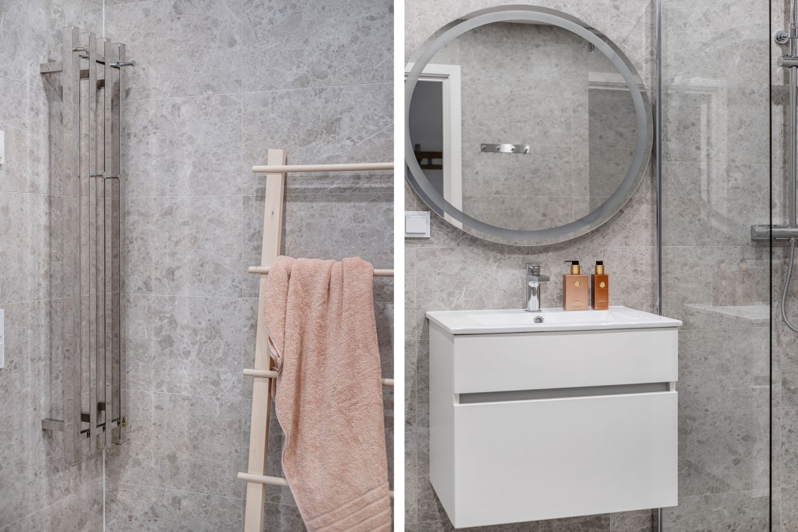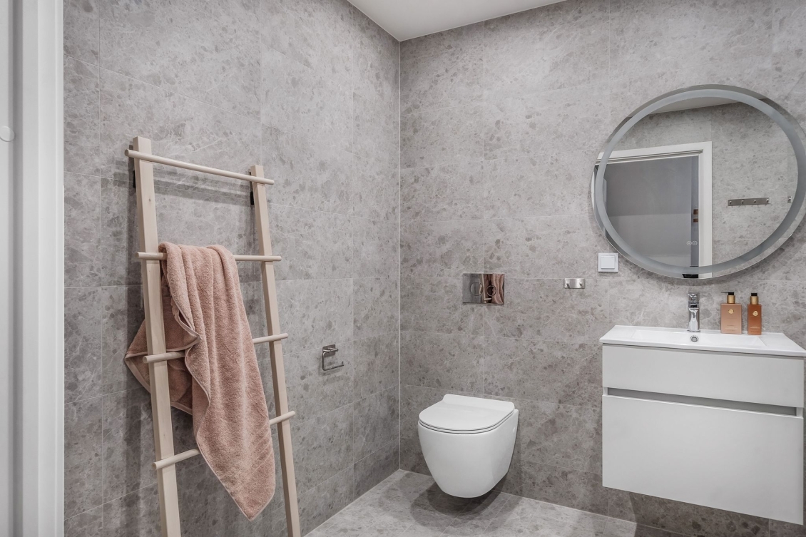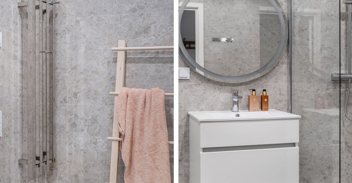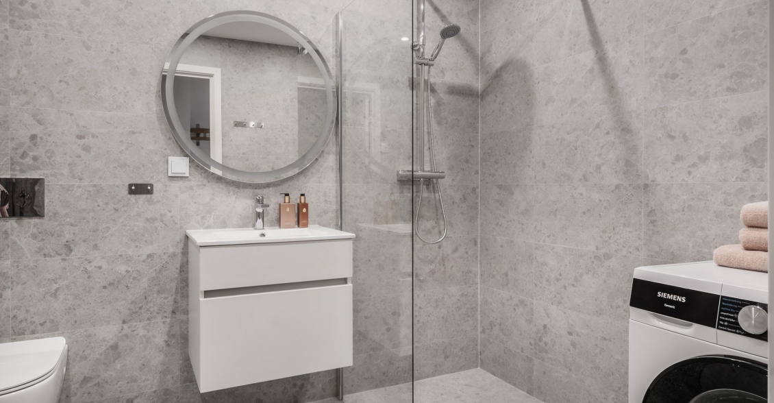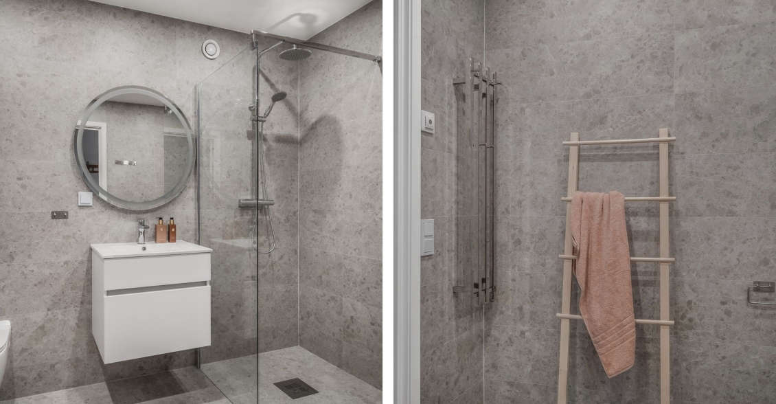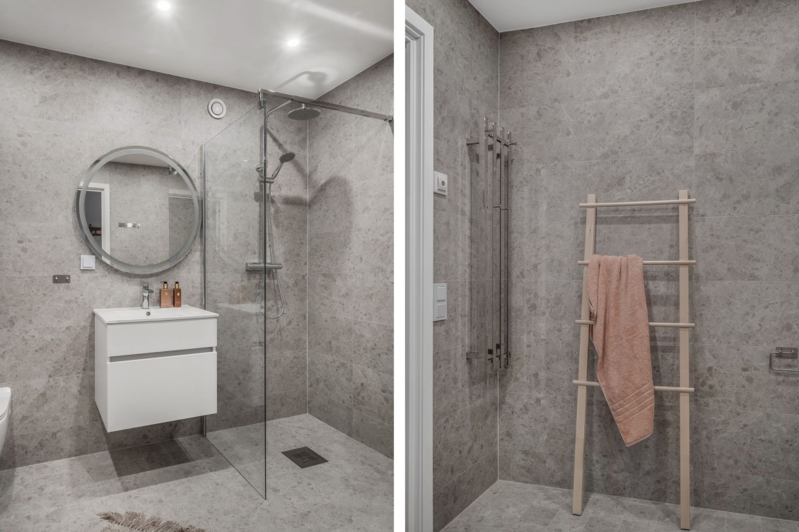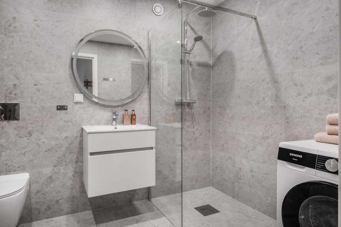 Helkaklat badrum med kakelsättning som för tankarna till ett spa. Vägghängd WC, handfat med kommod, spotlights, handdukstork och dusch med duschväggar i klarglas. Kombinerad tvätt/torkmaskin från Siemens. Golvvärme.