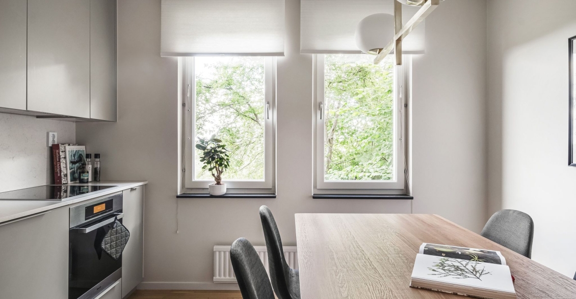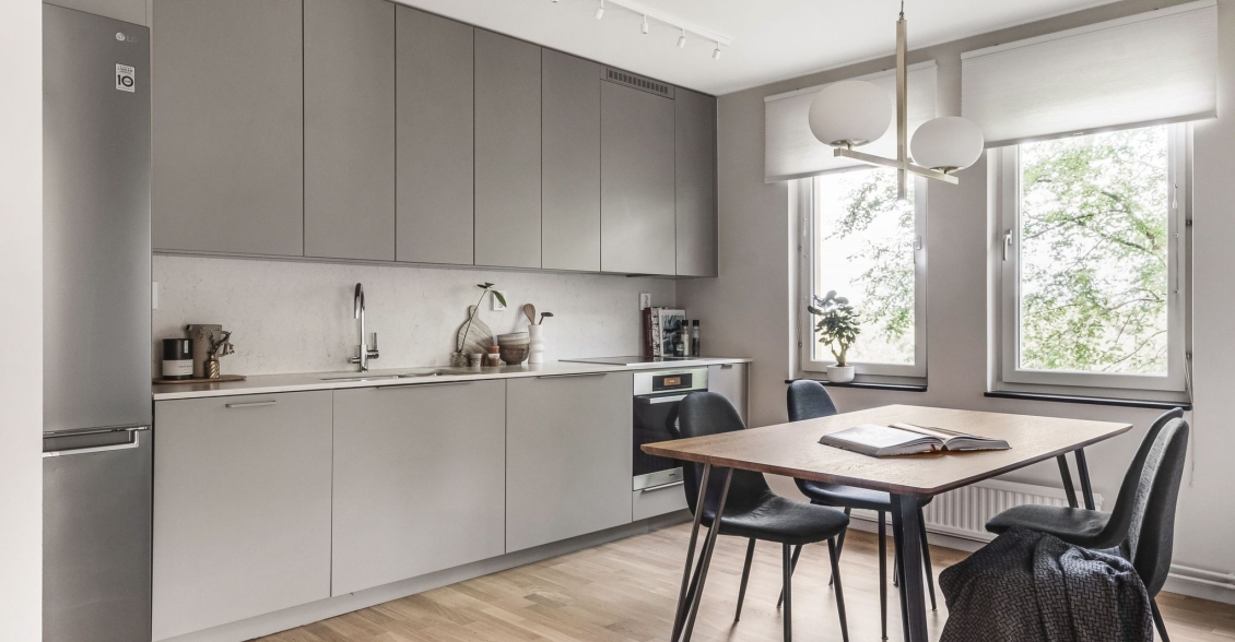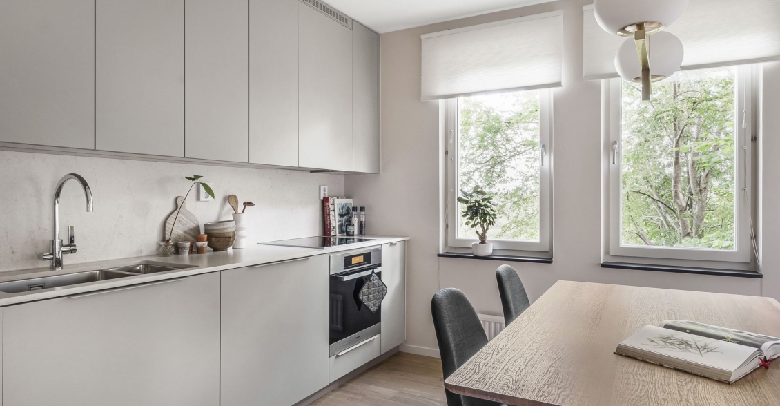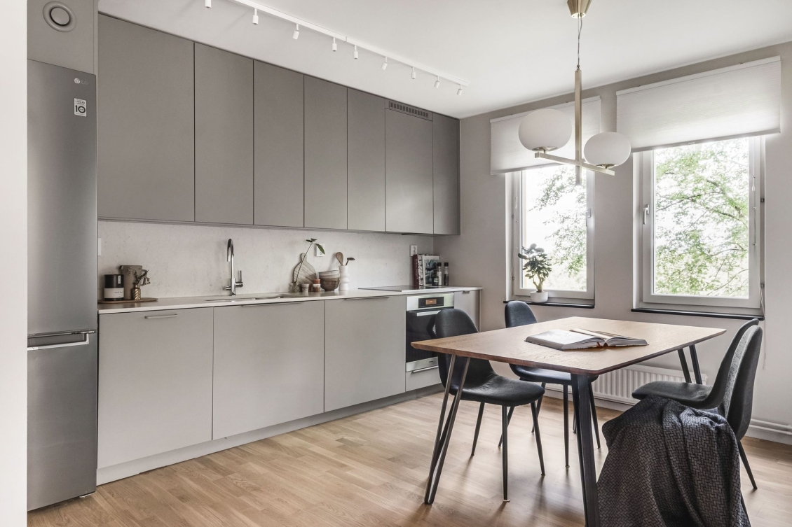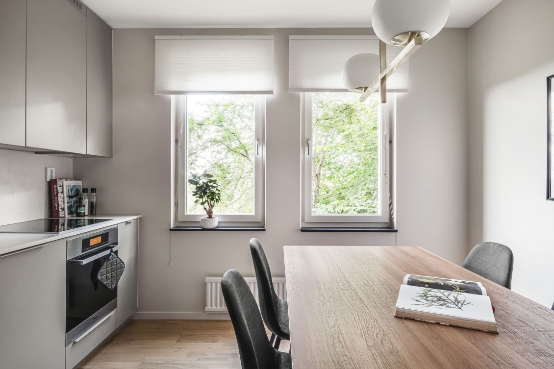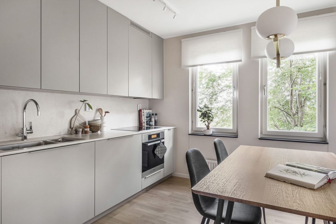Kök från Haga i behaglig grå nyans. Arbetsytor och stänkskydd i sten. Utrustat med induktionshäll, ugn och diskmaskin från Miele. Kyl/frys i rostfritt från Miele. Blandare och handfat från Franke. Gott om plats för middagsbord intill fönster. Även från köksfönstren avnjuts en lummig utsikt.