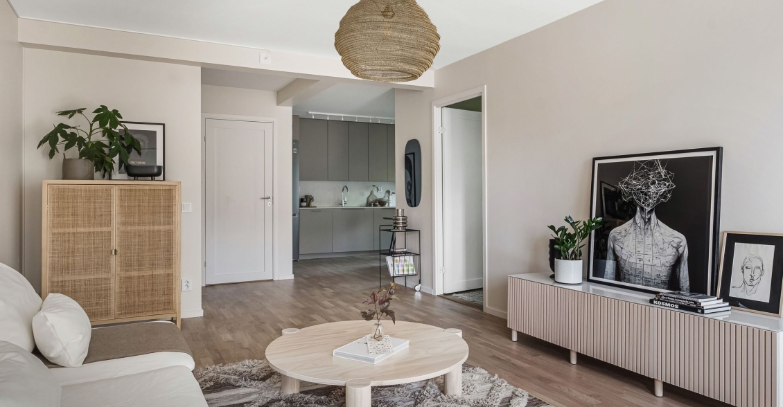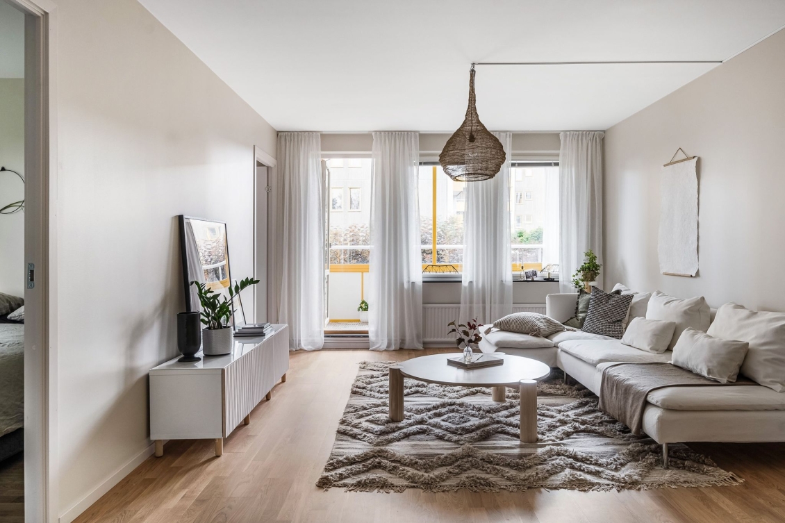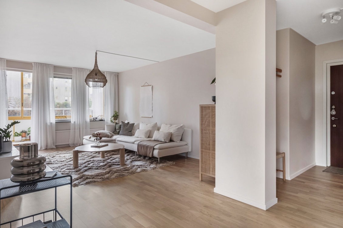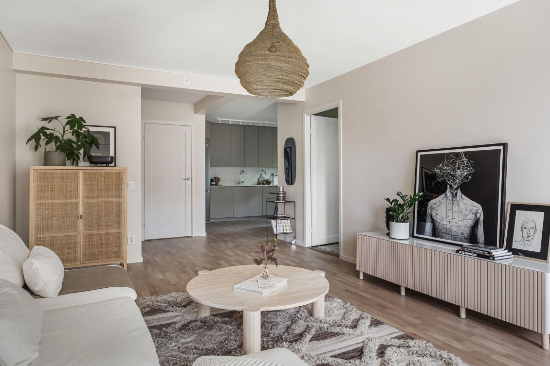Ljust luftigt vardagsrum i öppen planlösning mot kök. Utgång till inglasad balkong med söderläge.