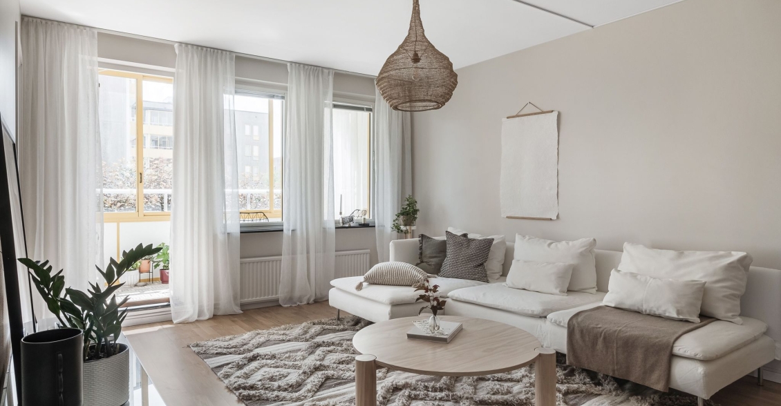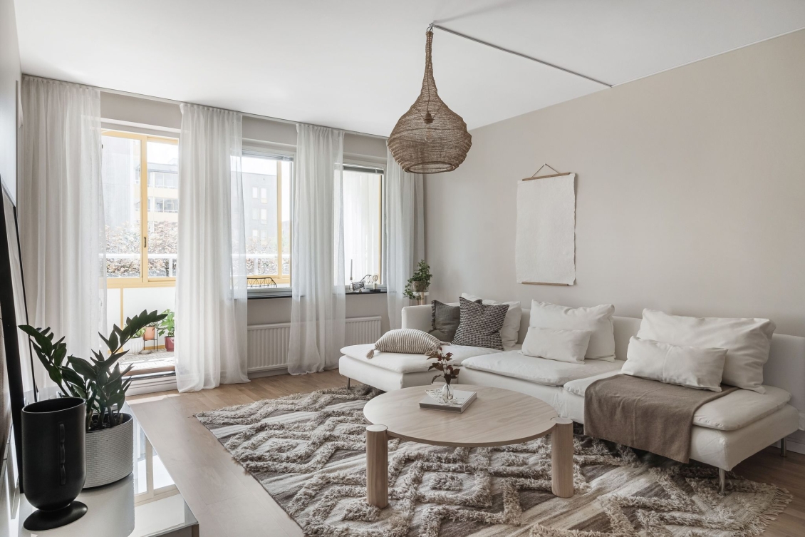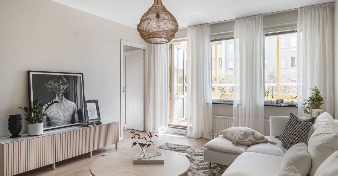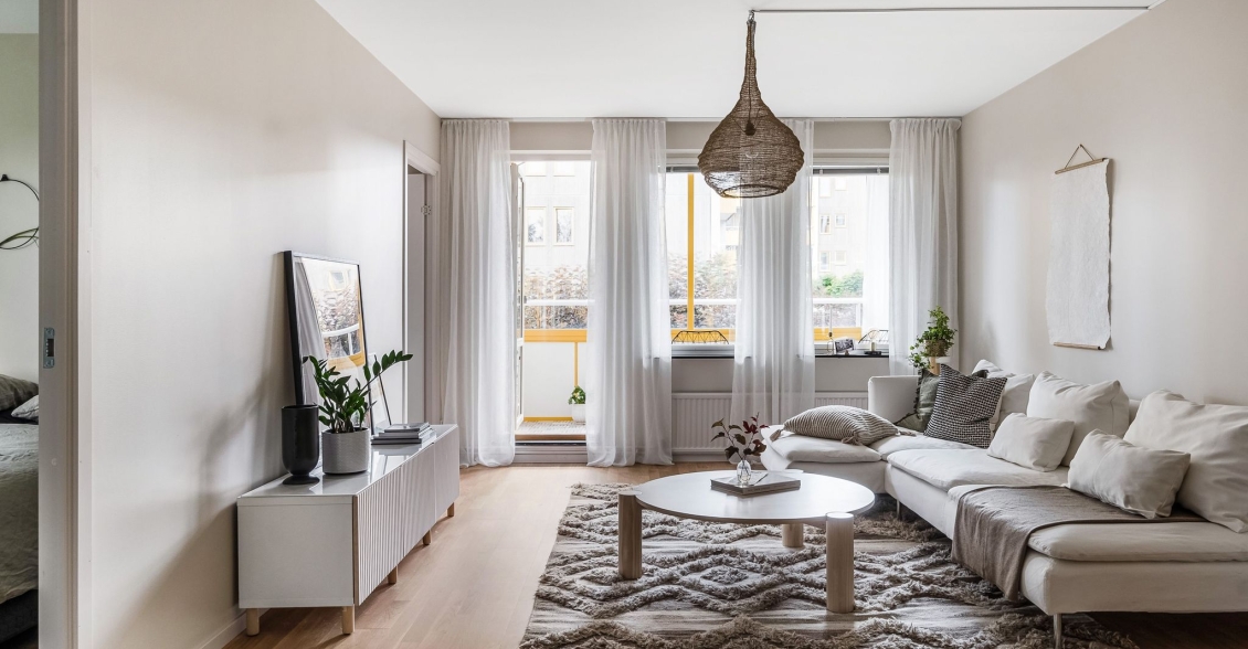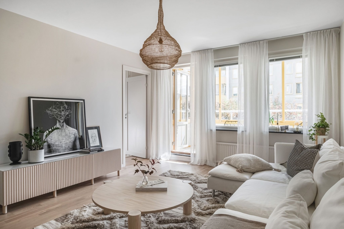 Ljust luftigt vardagsrum i öppen planlösning mot kök. Utgång till inglasad balkong med söderläge.