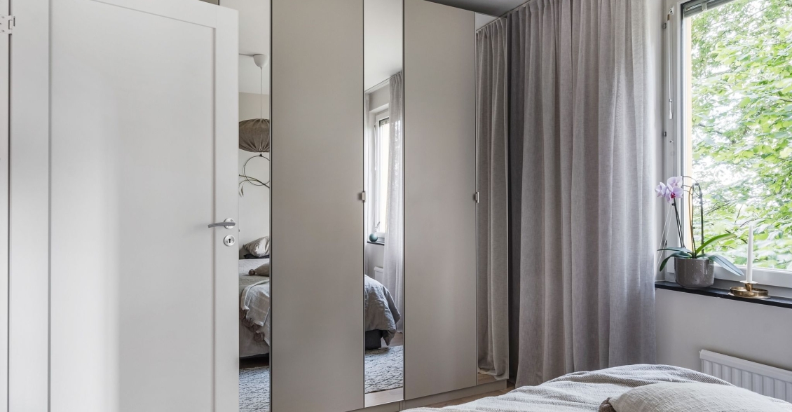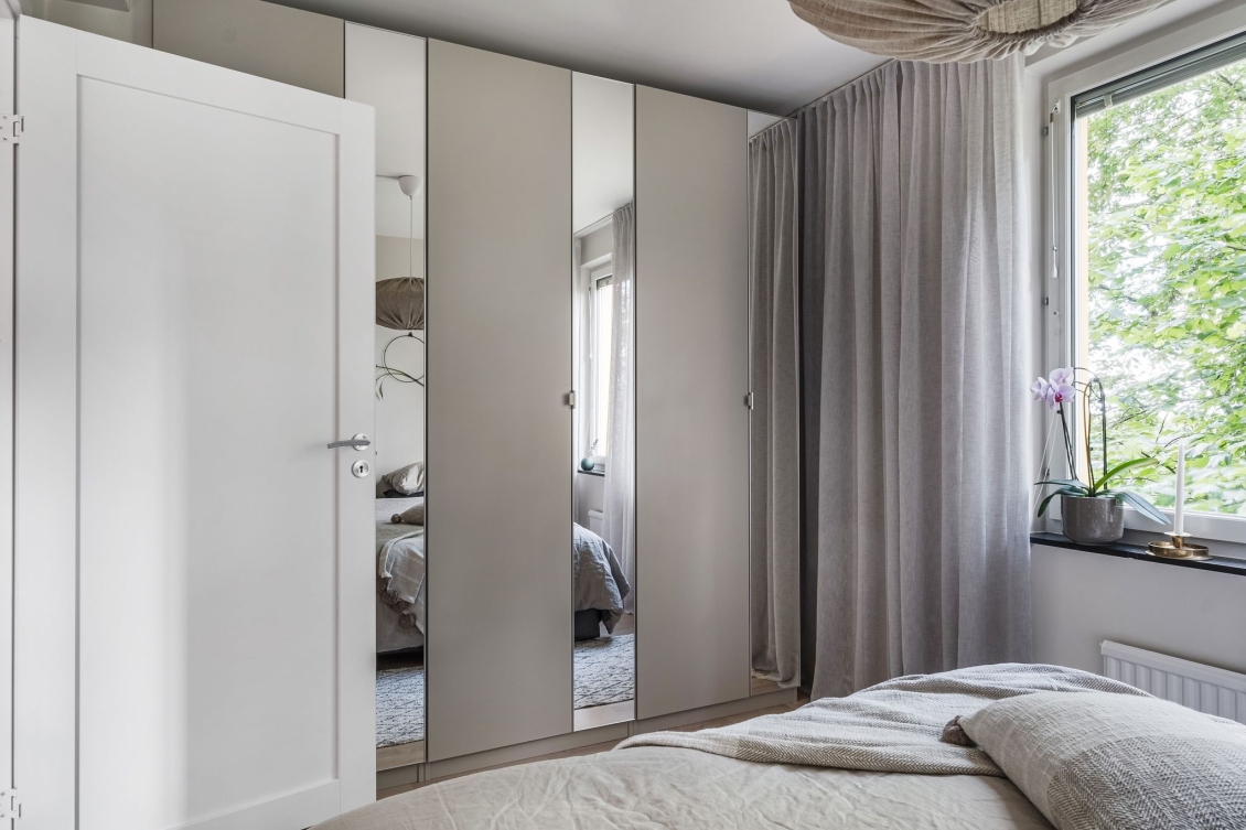 Rofyllt Master Bedroom med utsikt mot trädkronor och gräsyta. Gott om plats för dubbelsäng och sängbord. Tre inredda garderober med speglar.