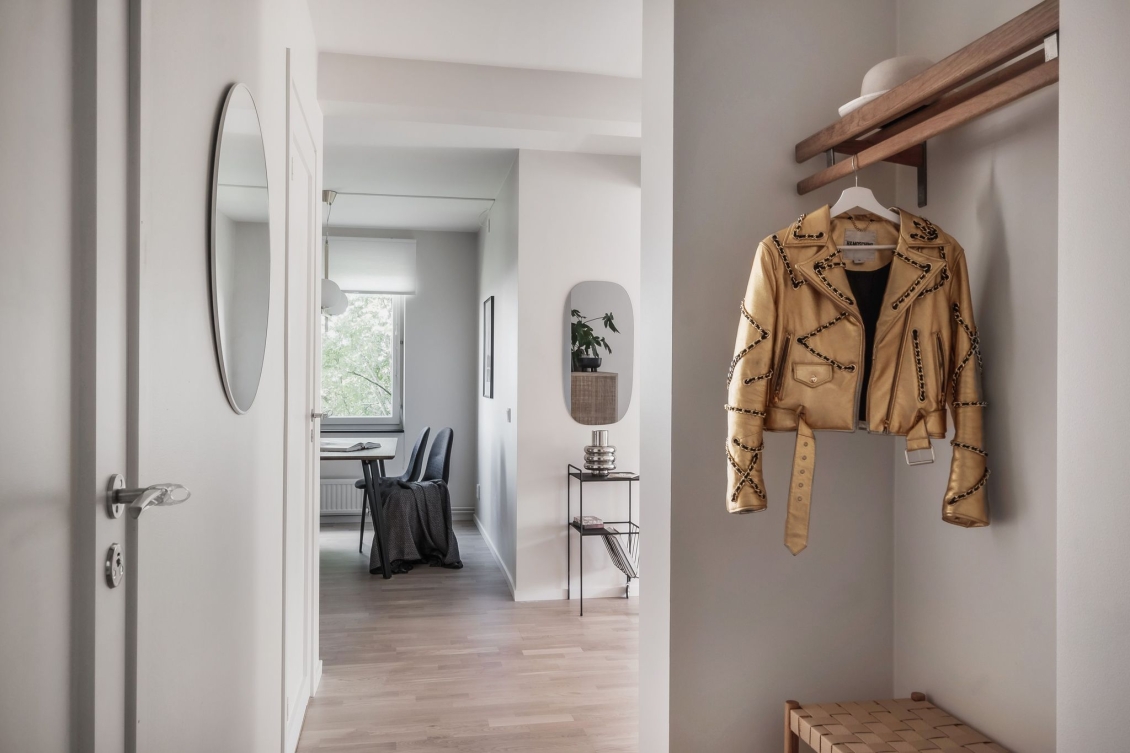 Inbjudande hall med hatthylla i ek
