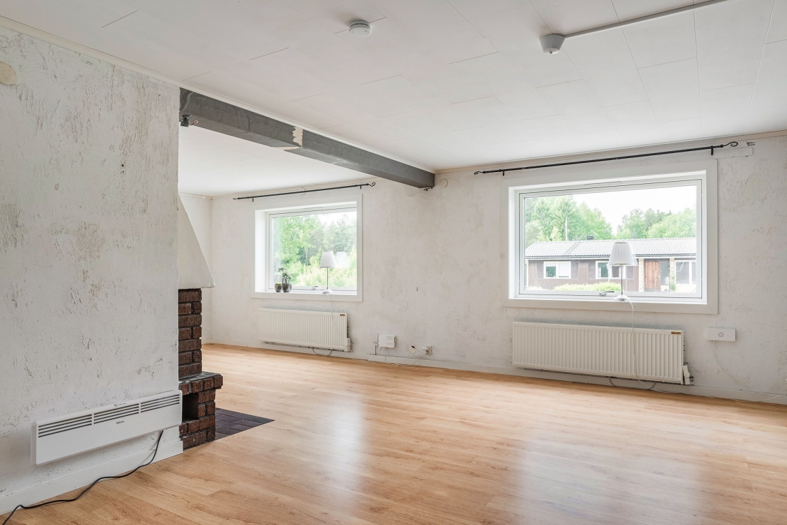 Vardagsrum Ett stort fönsterparti skänker ljus och trivsel och i mitten finns en mysig eldstad. Vardagsrummet är tillräckligt stort för att rymma både middagsbord och soffmöblemang. Trevlig öppan planlösning mot kök.