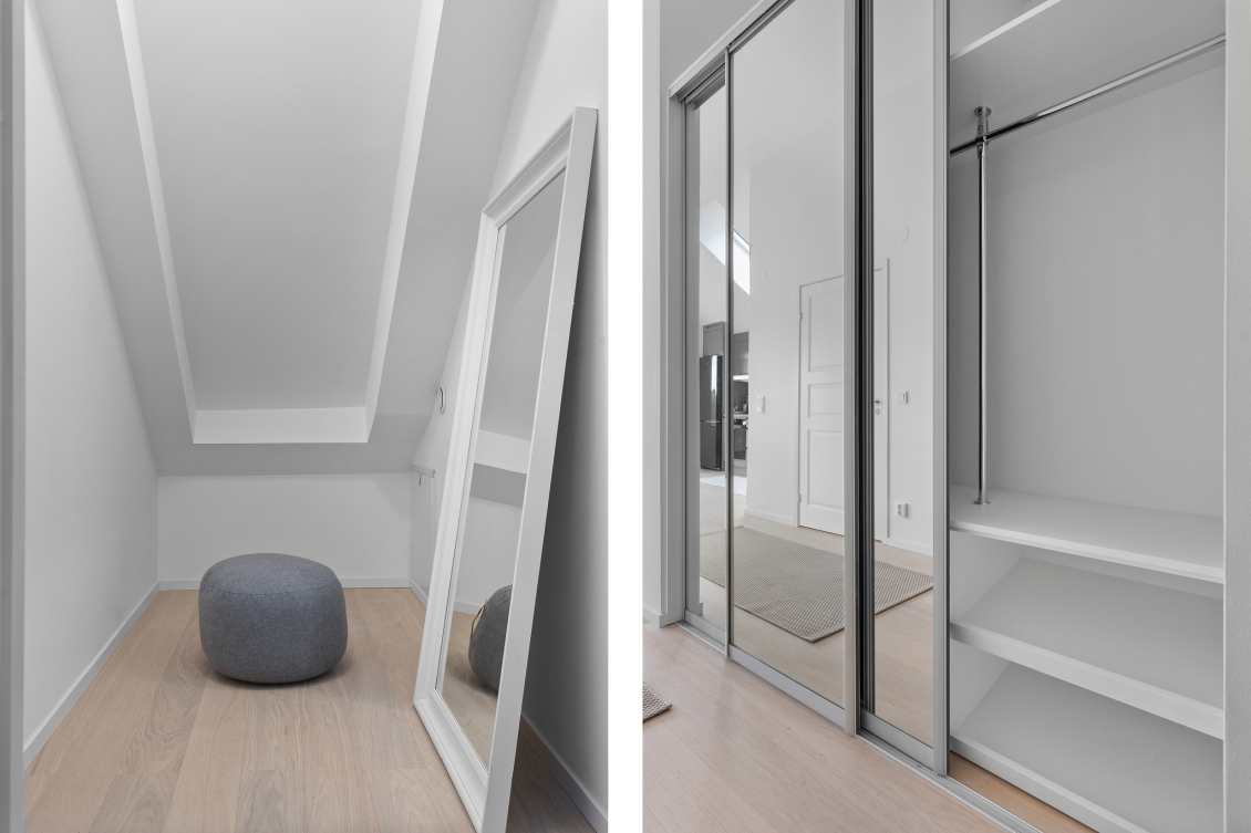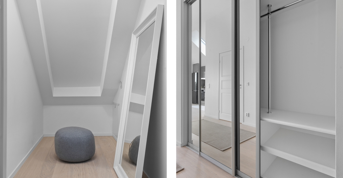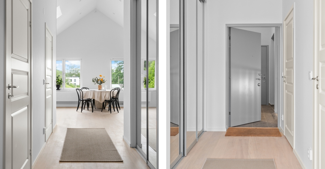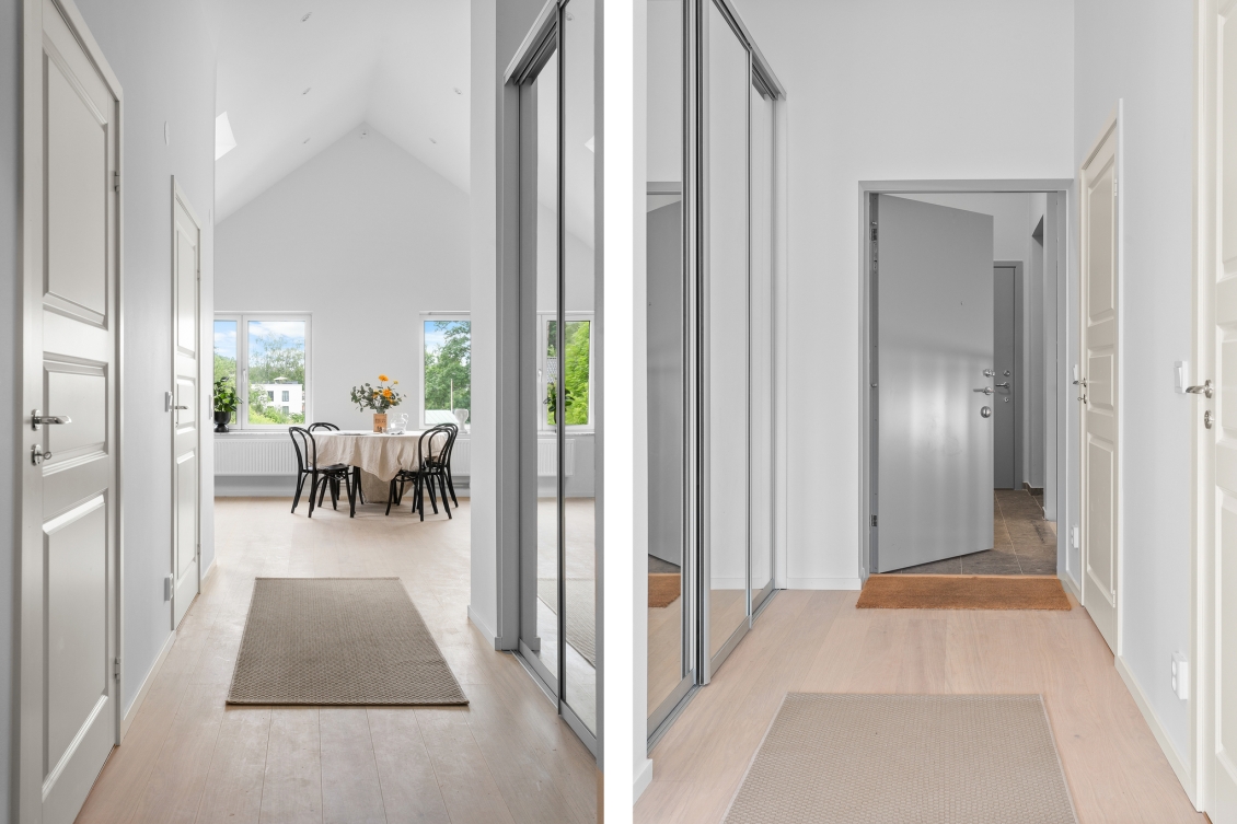 Inbjudande hall med snygg och praktisk skjutdörrsgarderob med spegeldörrar.