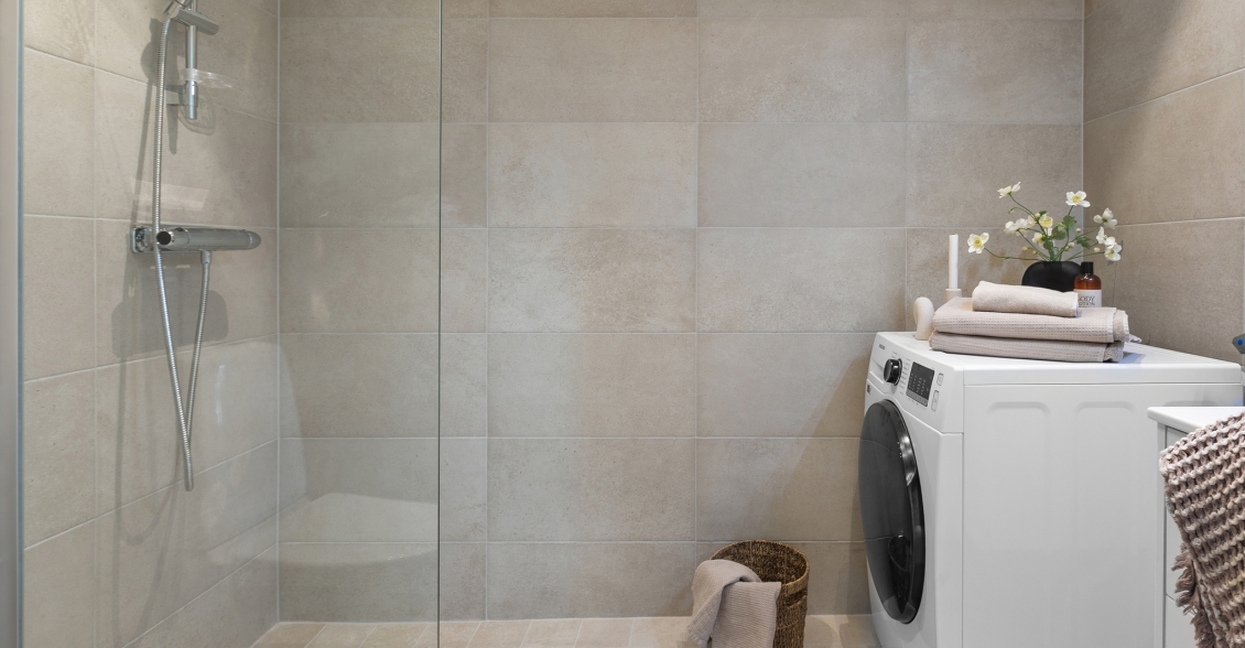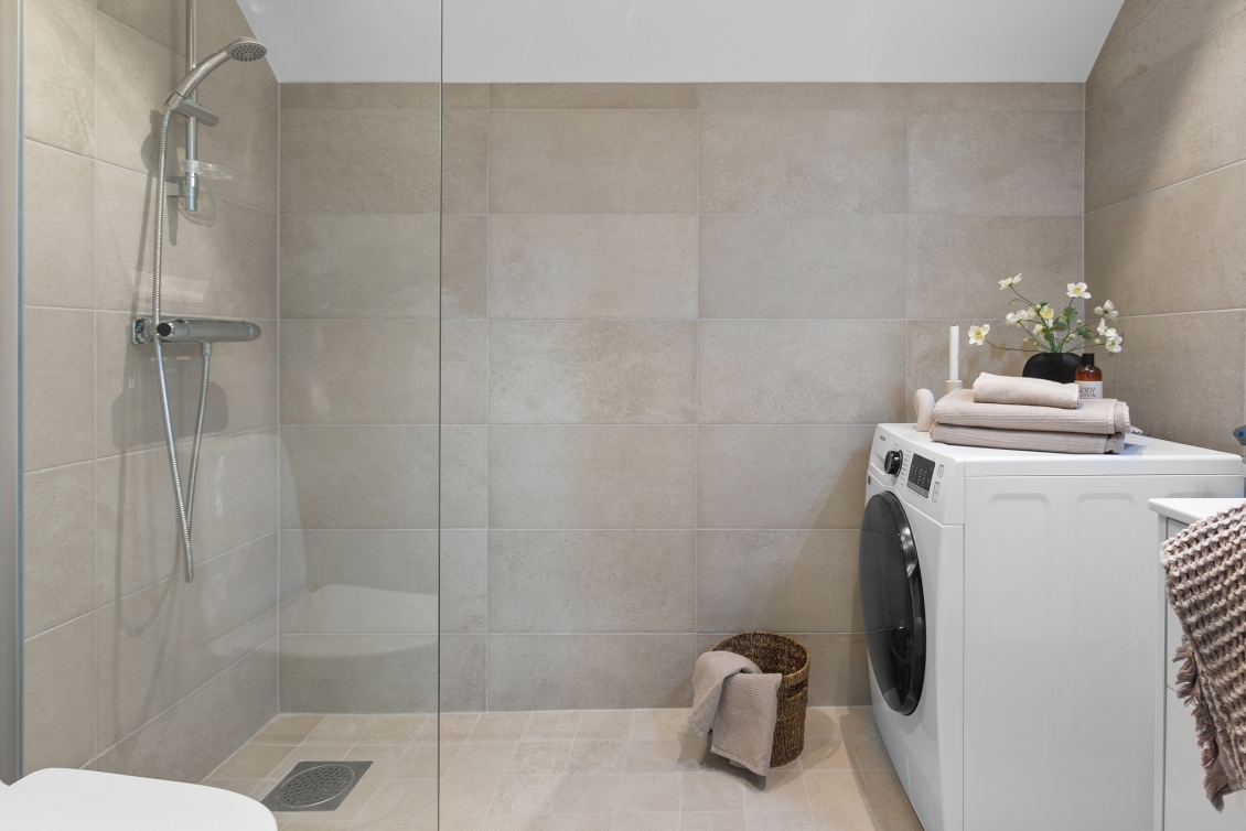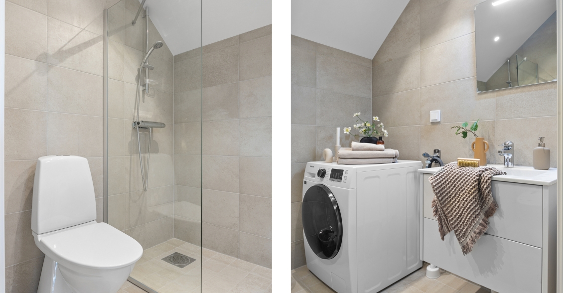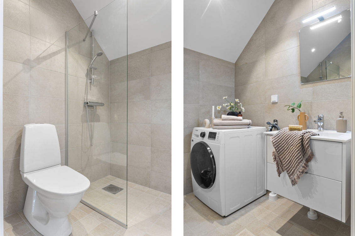 Helkaklat badrum med dusch, wc och handfat med kommod. Tvättmaskin och torktumlare.