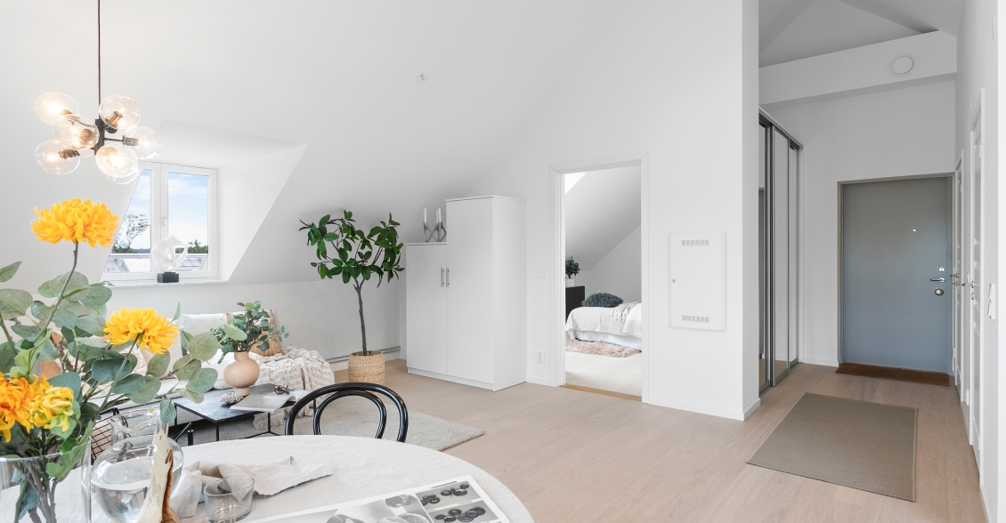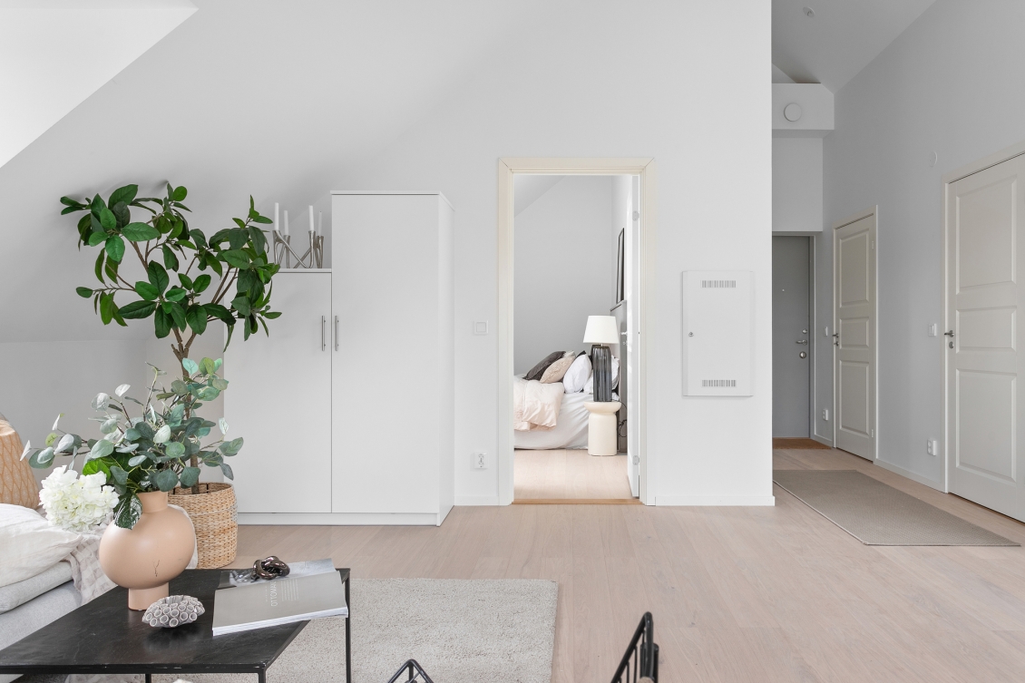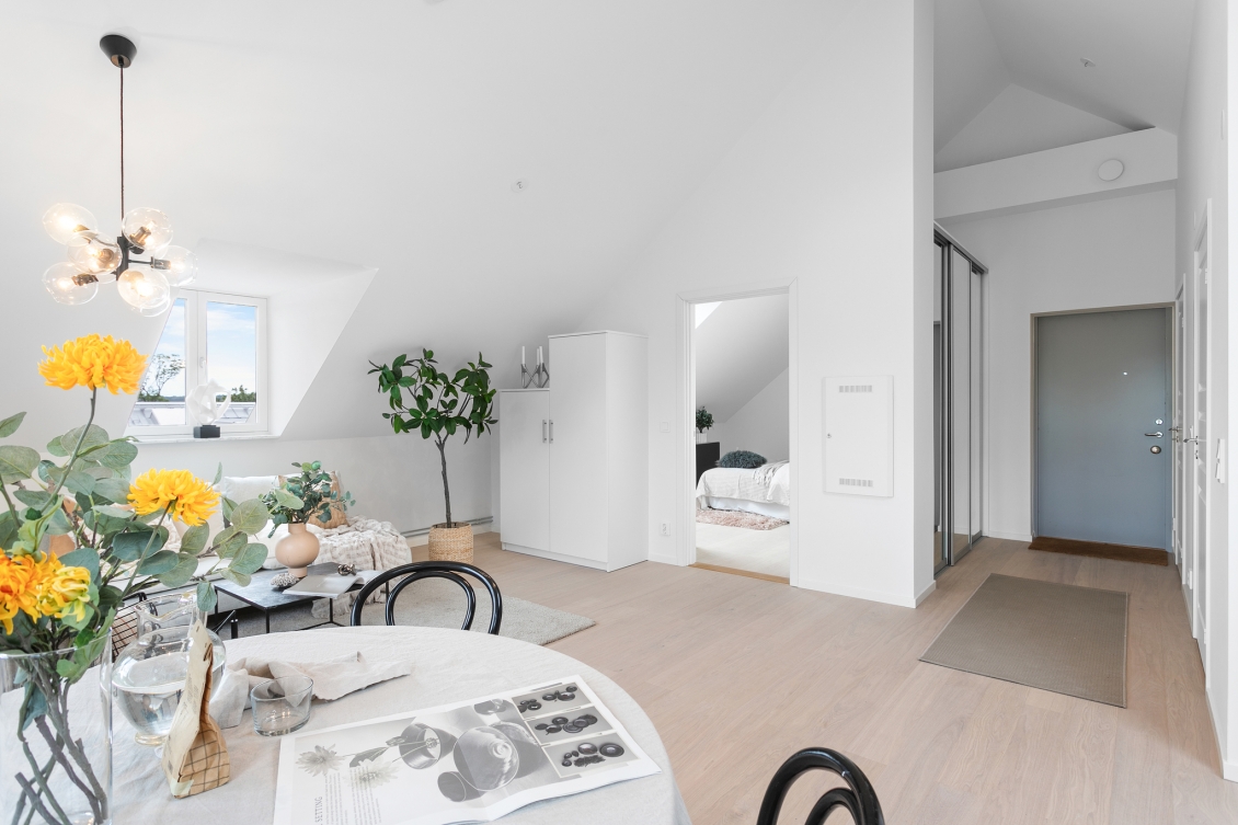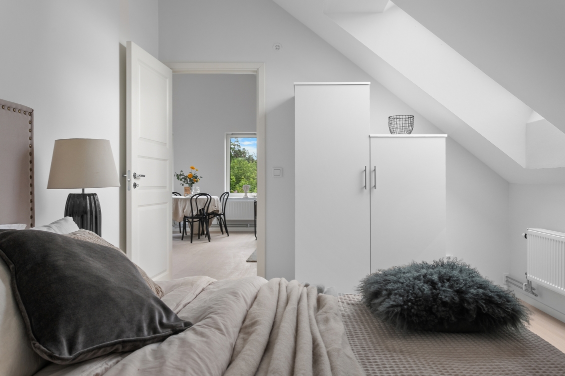 Bli först att flytta in i denna påkostade och välplanerade och helt insynsskyddade vindsvåning om två rum och kök. Vacker sjöutsikt mot Mälaren. Genomgående. Smakfullt och stilrent så som genomgående vitpigmenterat enstavigt ekgolv och vitmålade väggar. Vitvaror från Siemens.
