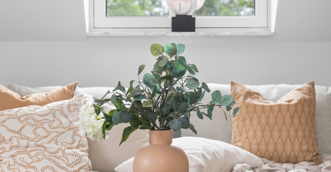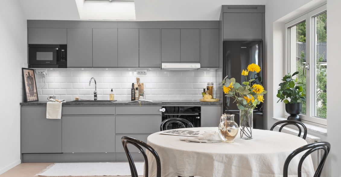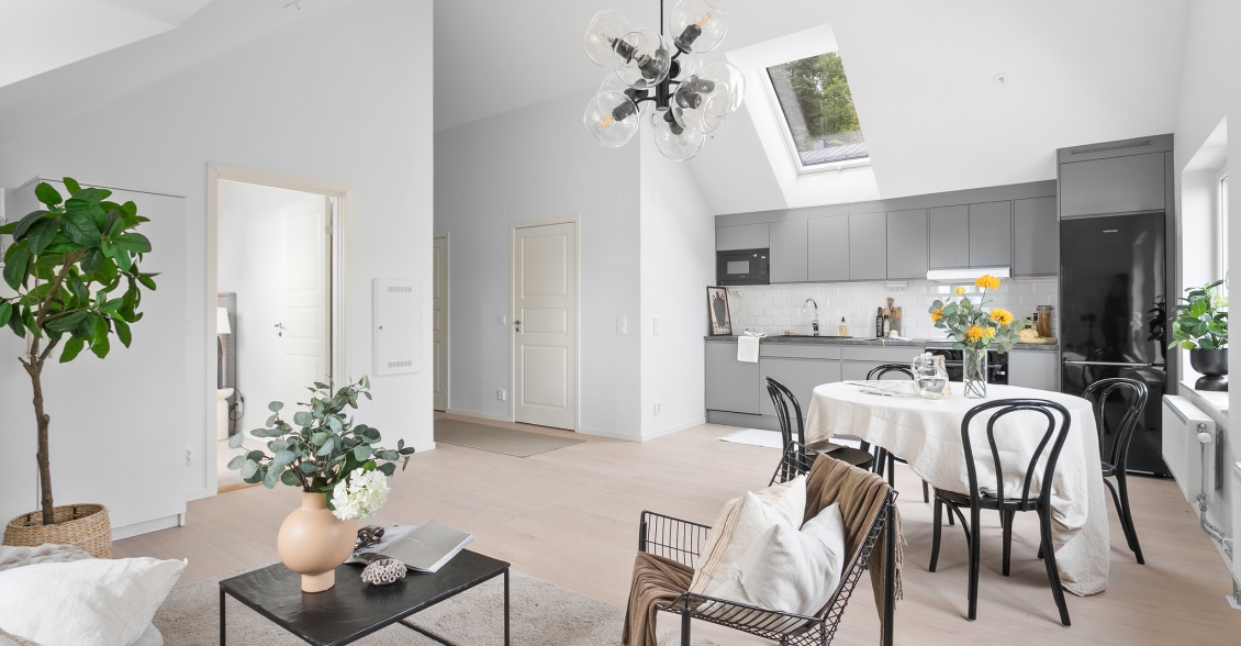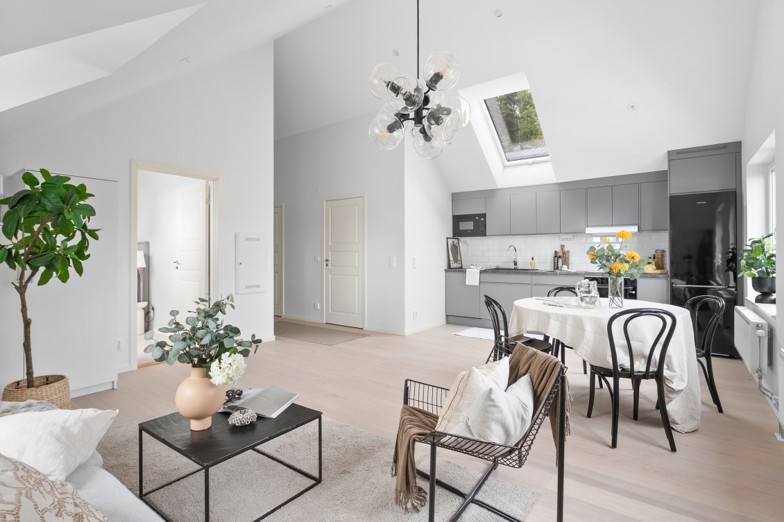 Vardagsrum och kök i ljus öppen planlösning mot kök.