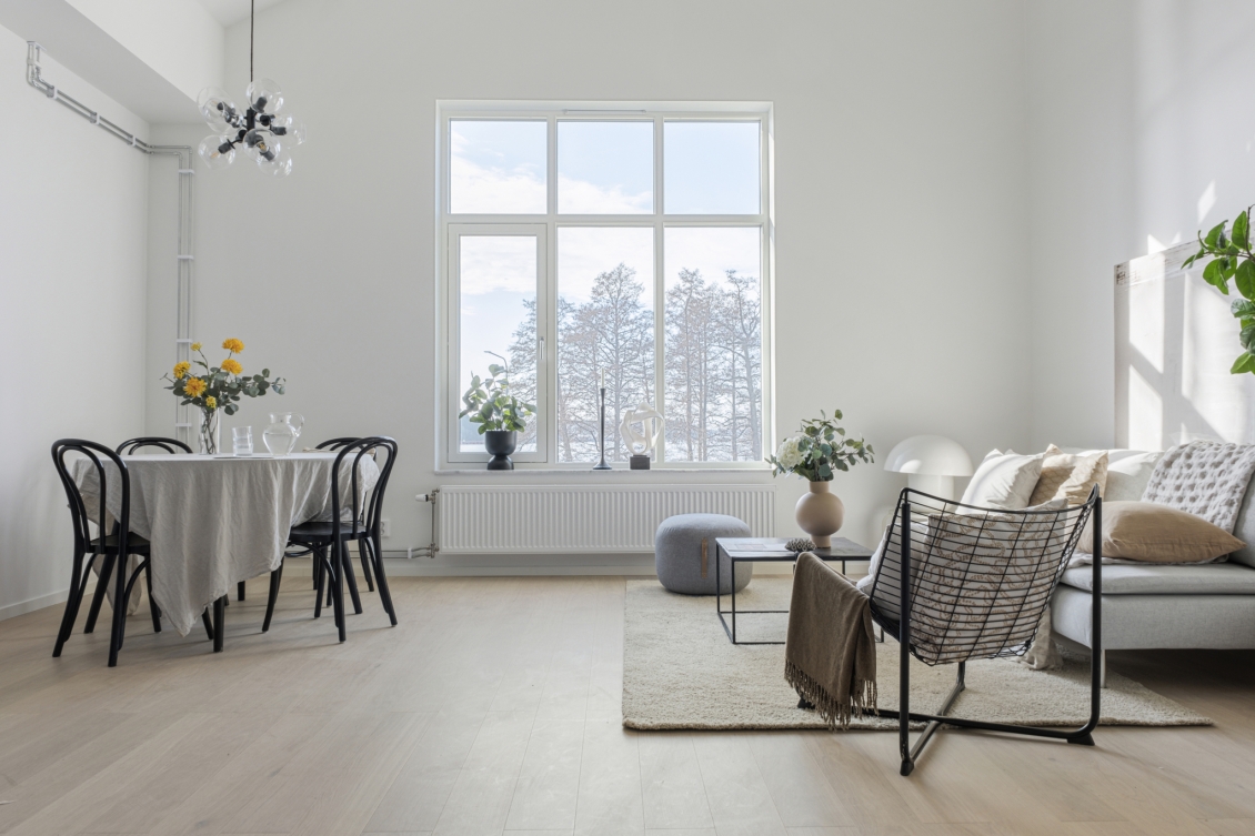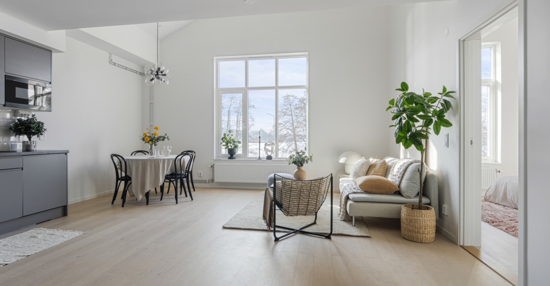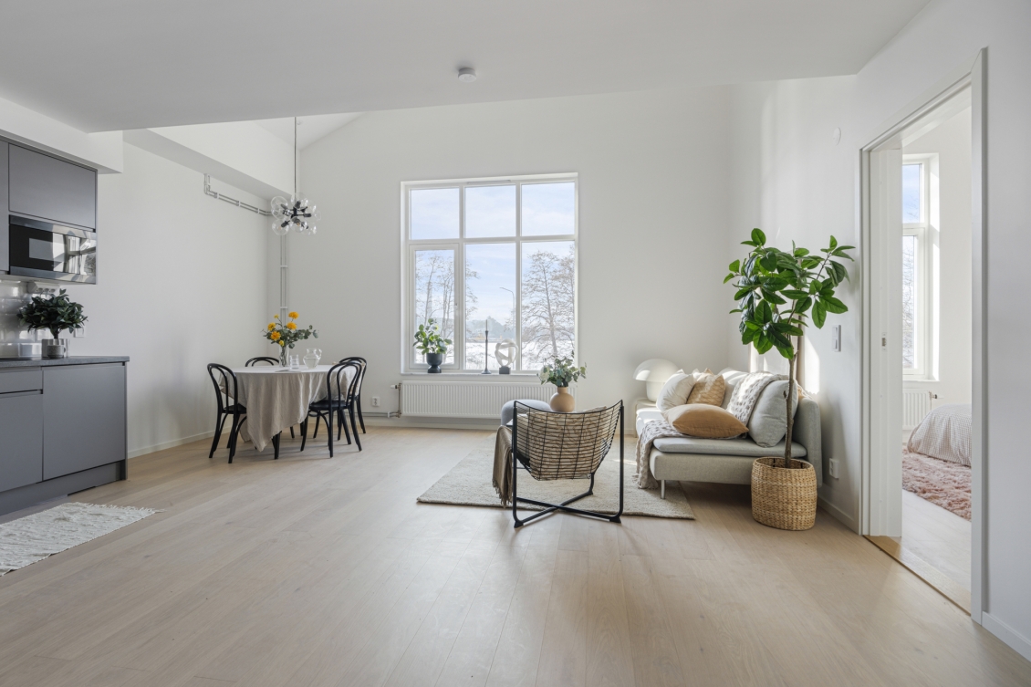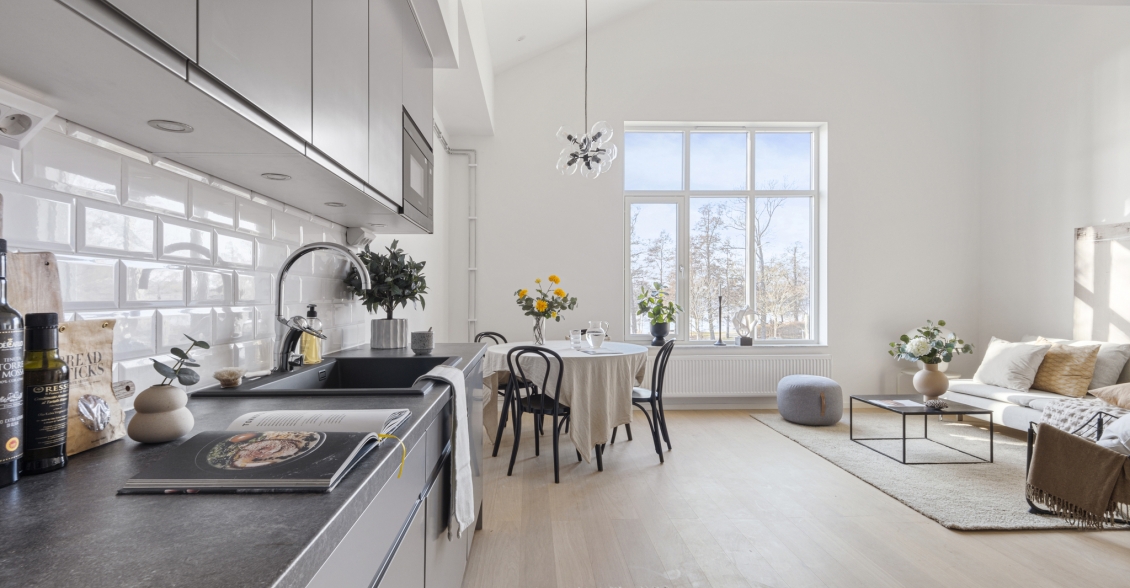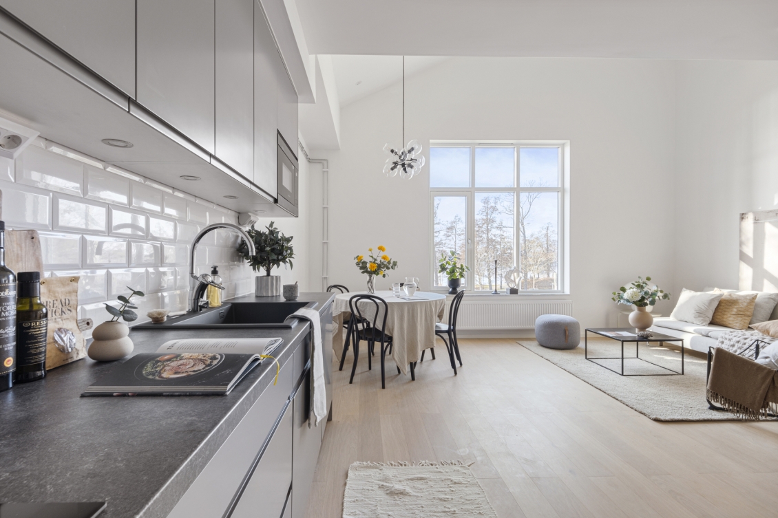 Vardagsrum och kök i ljus öppen planlösning mot kök.