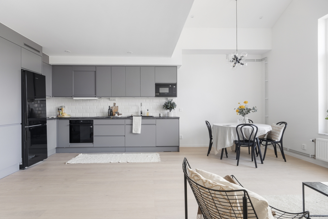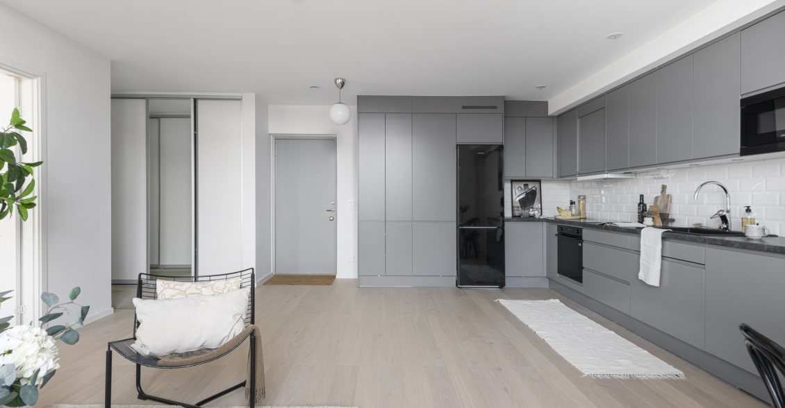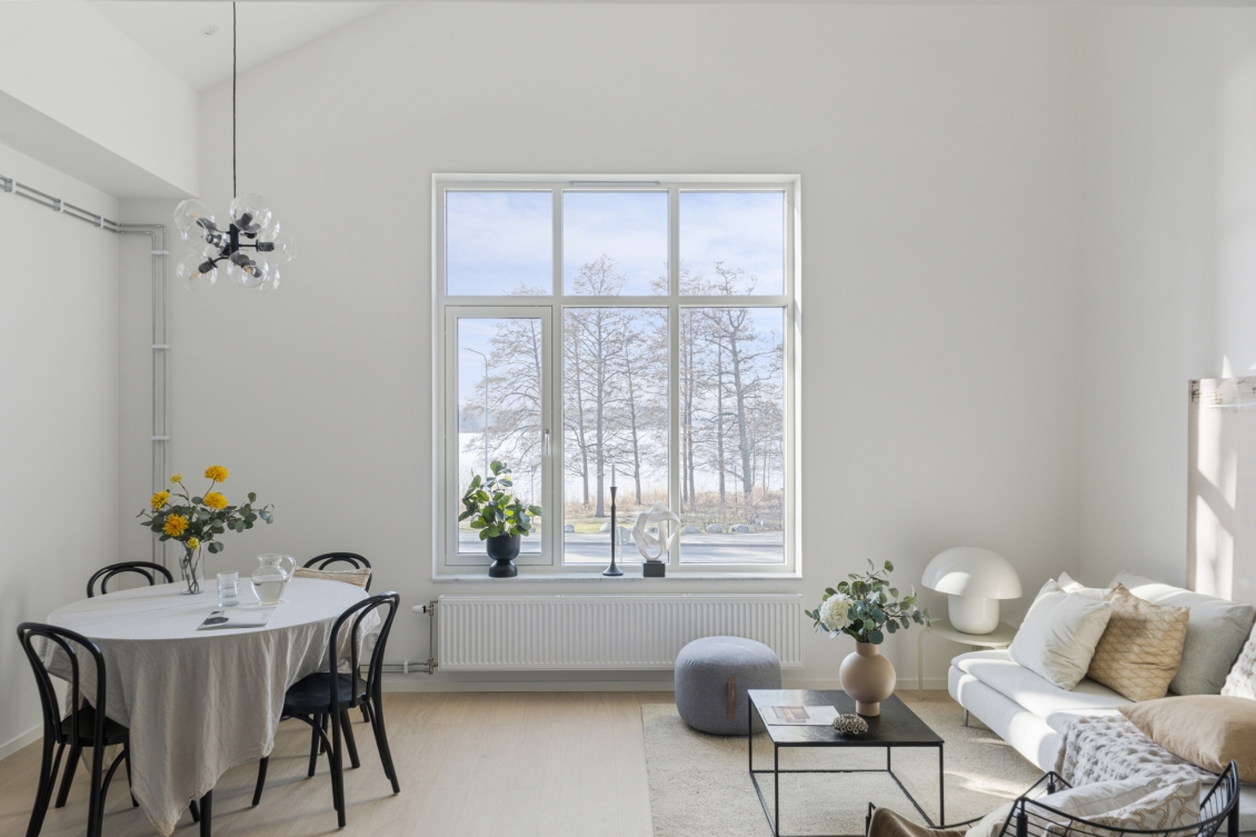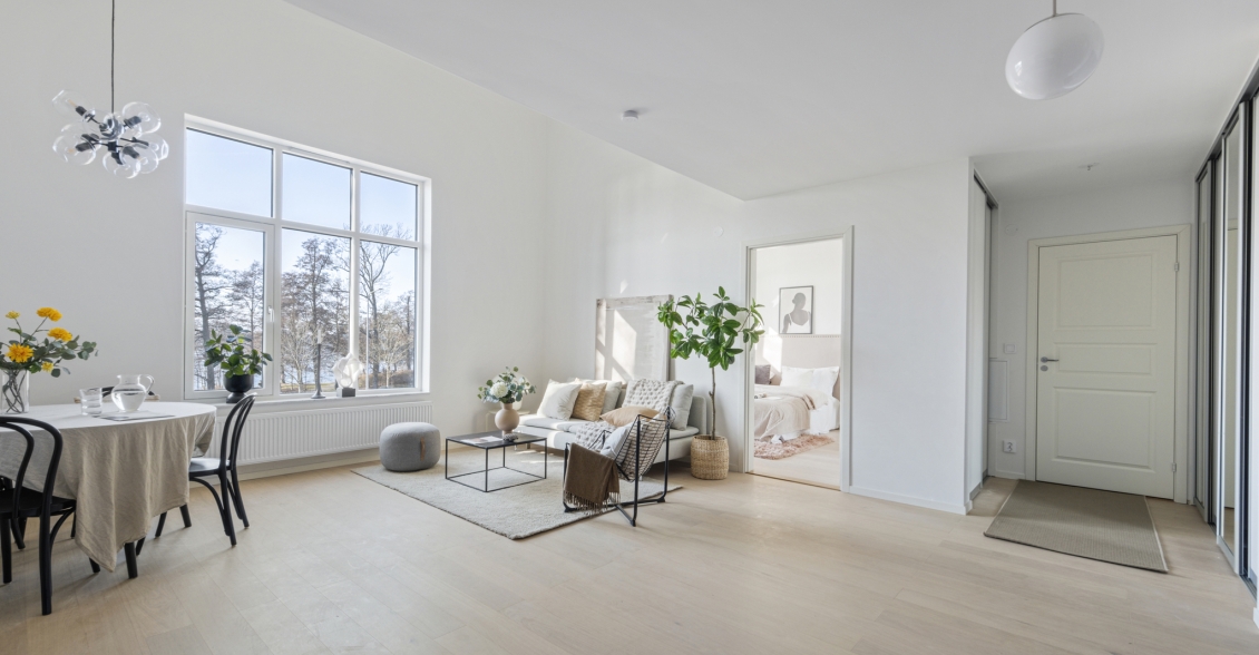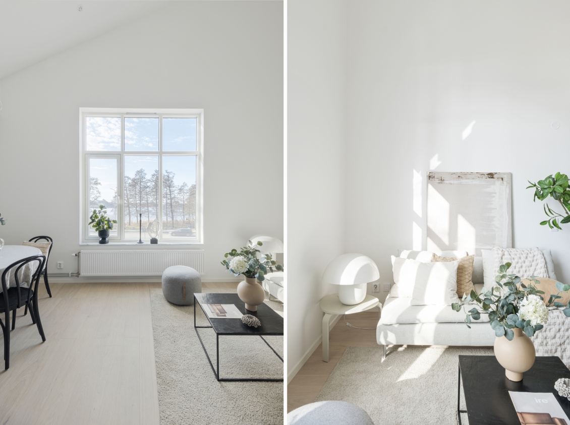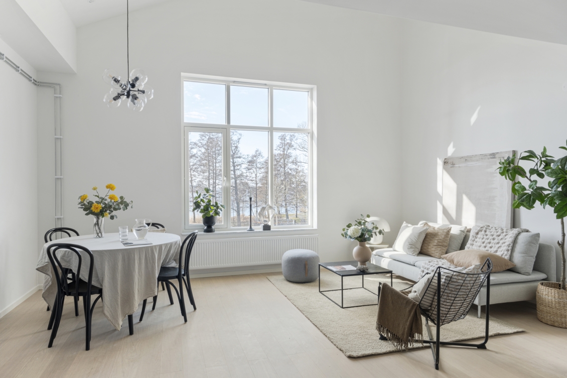 Vardagsrum och kök i ljus öppen planlösning mot kök.