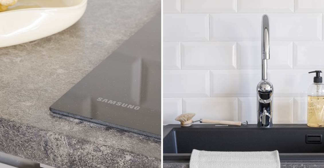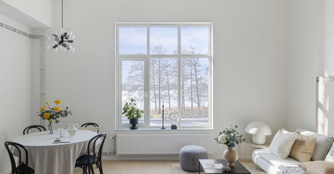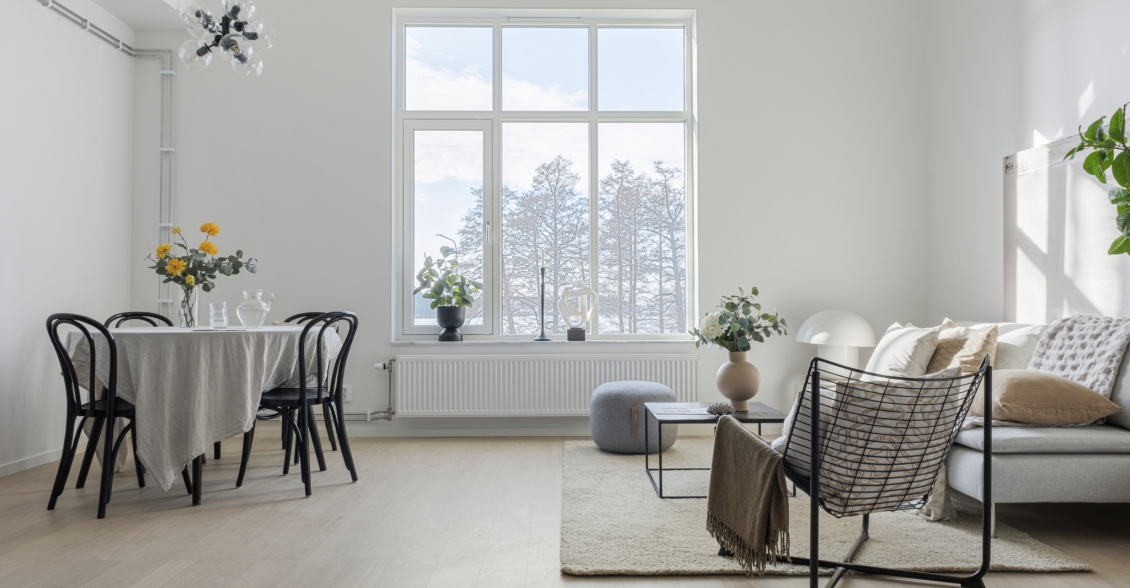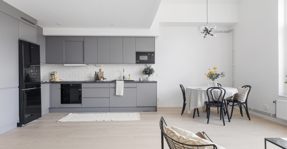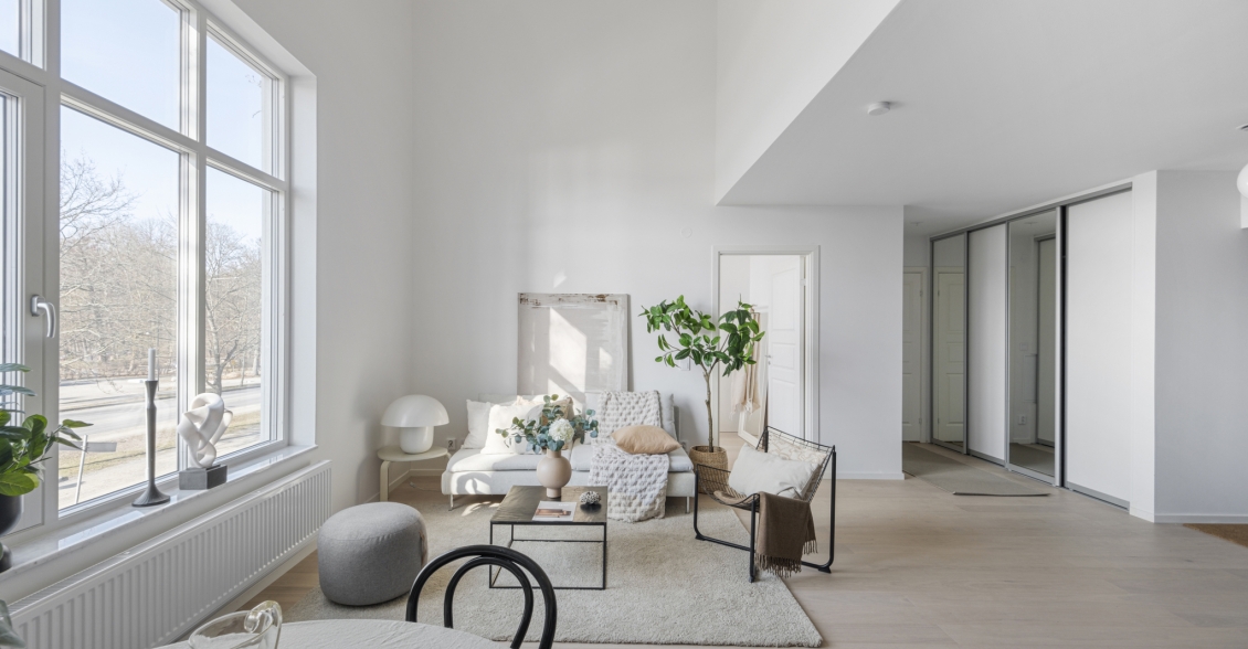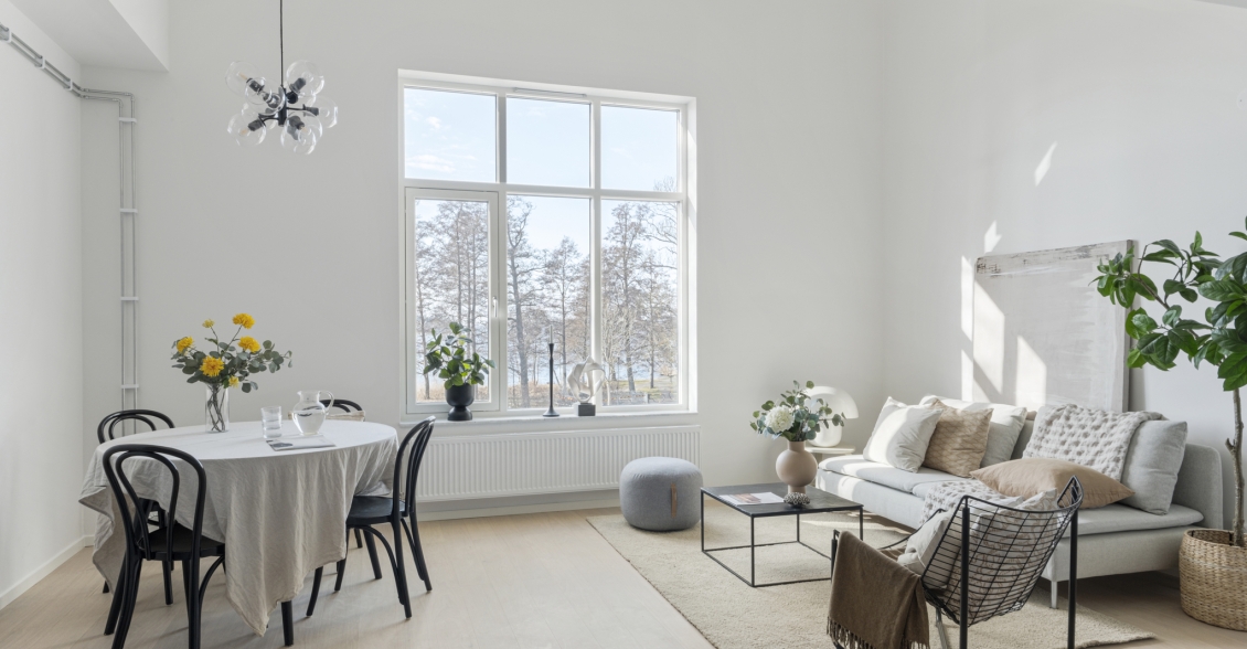 Vardagsrum och kök i ljus öppen planlösning mot kök.