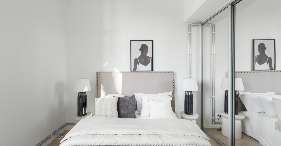 Inbjudande hall med snygg och praktisk skjutdörrsgarderob med spegeldörrar.