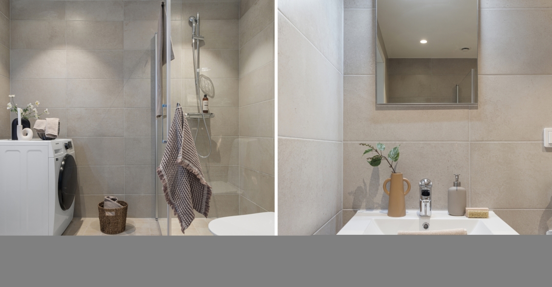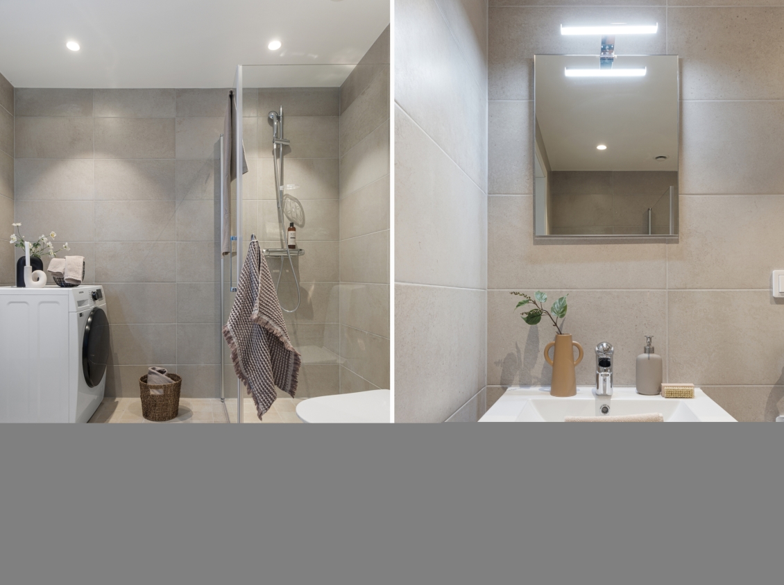 Helkaklat badrum med dusch, wc och handfat med kommod. Tvättmaskin och torktumlare.
